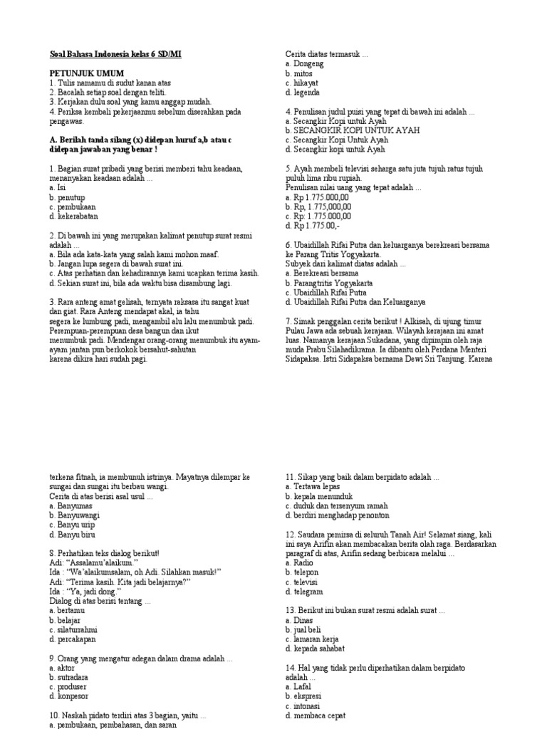 45 Contoh Soal Uts Bahasa Indonesia Kelas 6 Sd Mi Dan Kunci Jawaban Pdf